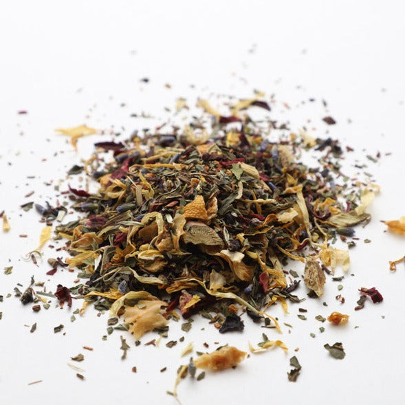 Ingredients: Orange, hibiscus, rooibos tea, peppermint leaves, licorice, lemon balm, lavender, passion flowers, milk thistle, and marigold flowers.