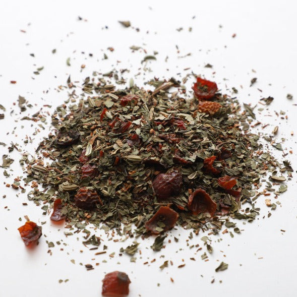 Ingredients: Rose hips, raspberry leaves, rooibos tea, fennel, spearmint leaves, lemon verbena.