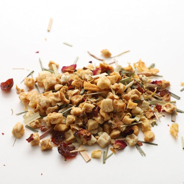 Ingredients: Blended with Apple pieces, Rose Hips, Lemon Grass, Orange, natural Pineapple flavor, Pineapple pieces, Rose petals, Marigold flowers, and natural Orange flavor.