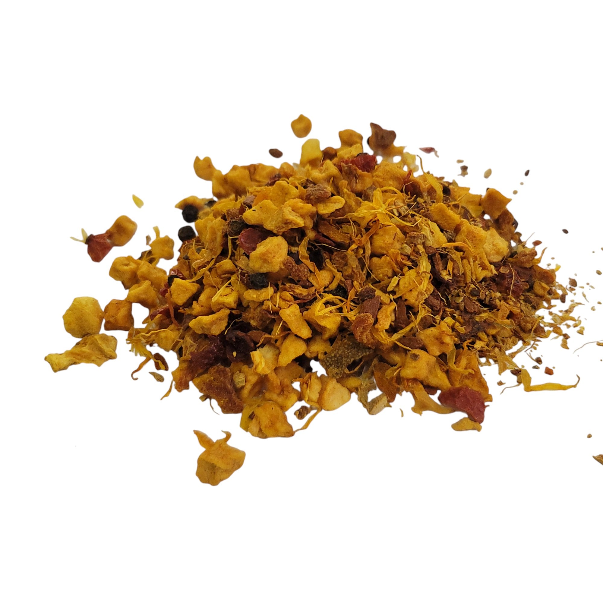 Ingredients: Apple pieces, cinnamon, ginger, orange, rose hips, turmeric, mango pieces, marigold flowers, black peppercorn, natural mango flavor & natural orange flavor