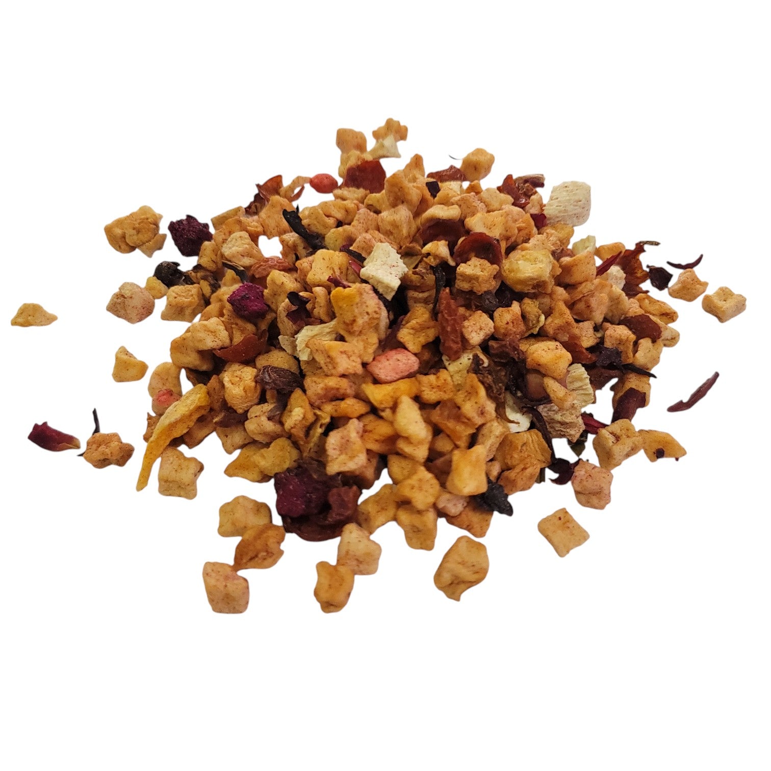 Ingredients:  Apple pieces, hibiscus, orange, rose hips, lemon verbena, dragonfruit, rose hips, dragonfruit flavor, pineapple pieces, marigold flowers, strawberries & rose petals
